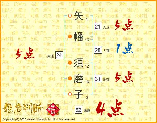 矢幡須磨子さんの総運は52画の4点!