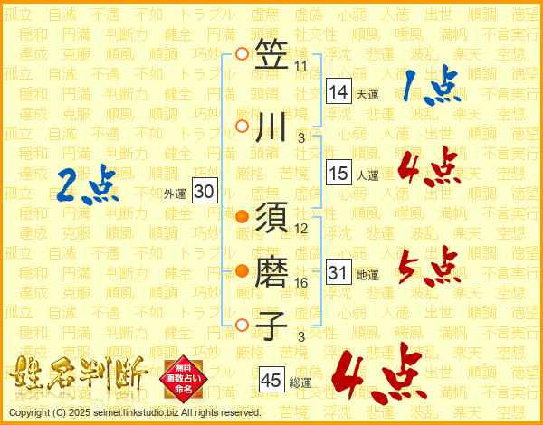 笠(11画)川(3画) 須(12画)磨(16画)子(3画)