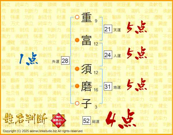 重(9画)富(12画) 須(12画)磨(16画)子(3画)