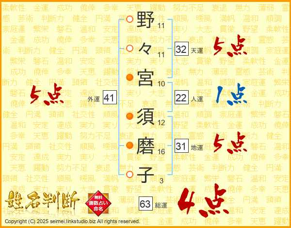 野(11画)々(11画)宮(10画) 須(12画)磨(16画)子(3画)