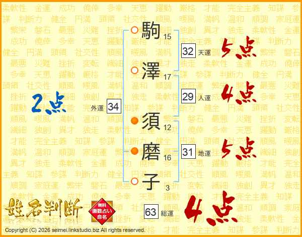駒(15画)澤(17画) 須(12画)磨(16画)子(3画)