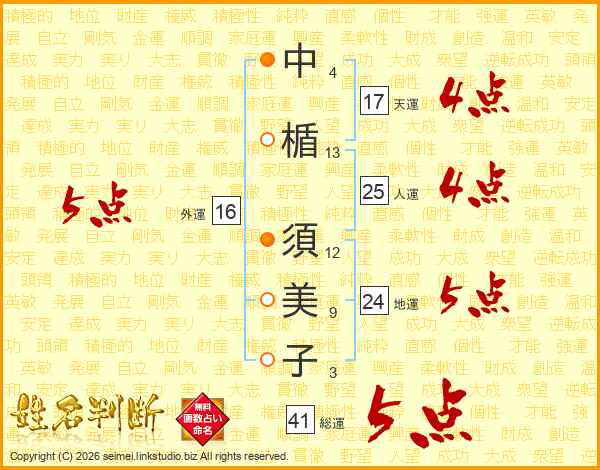 中(4画)楯(13画) 須(12画)美(9画)子(3画)