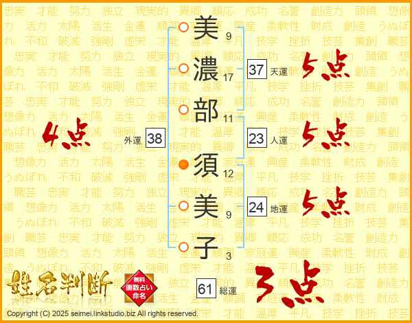 美(9画)濃(17画)部(11画) 須(12画)美(9画)子(3画)