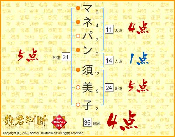 生活面を象徴する運勢です。外部から受ける影響力を表し、結婚運、家庭運や職場、環境への順応性を表します。総運から人運を引いた画数。姓や名が1文字の場合を除く。