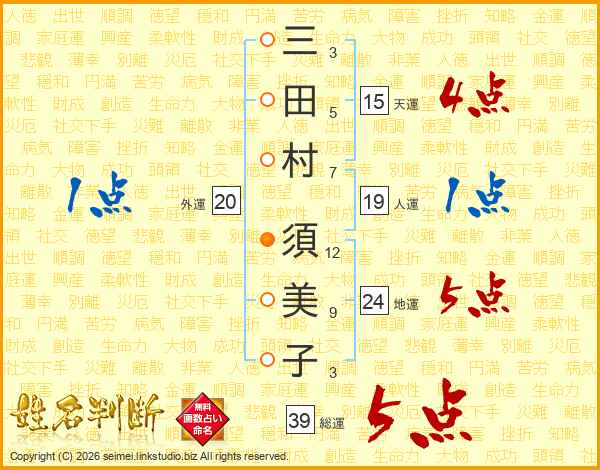 三田村須美子さんの総運は39画の5点!