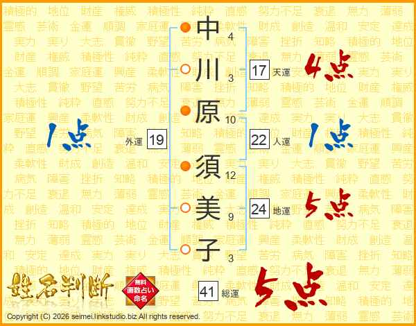 中(4画)川(3画)原(10画) 須(12画)美(9画)子(3画)
