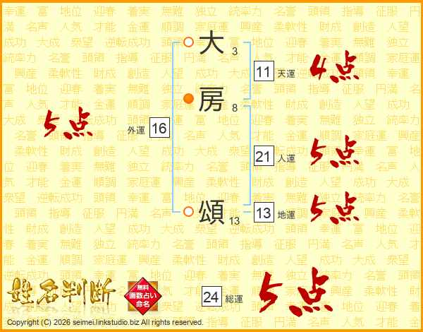 大房頌さんの人運は21画の5点!