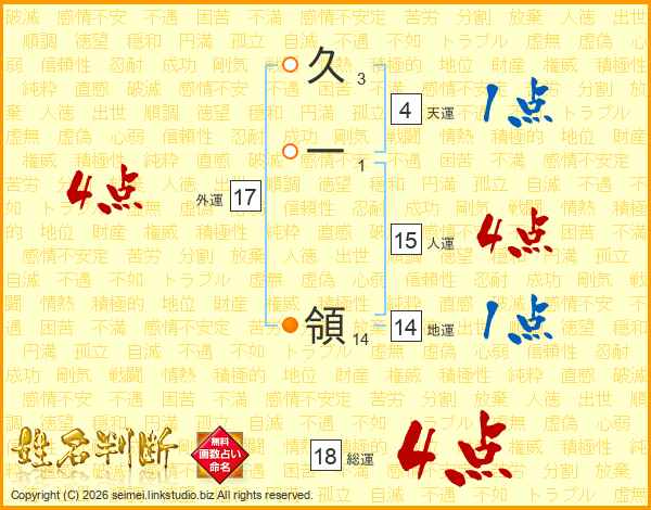 生活面を象徴する運勢です。外部から受ける影響力を表し、結婚運、家庭運や職場、環境への順応性を表します。総運から人運を引いた画数。姓や名が1文字の場合を除く。