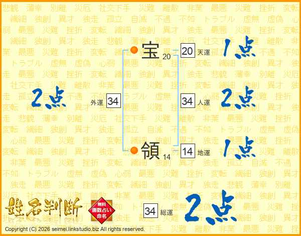 生活面を象徴する運勢です。外部から受ける影響力を表し、結婚運、家庭運や職場、環境への順応性を表します。総運から人運を引いた画数。姓や名が1文字の場合を除く。
