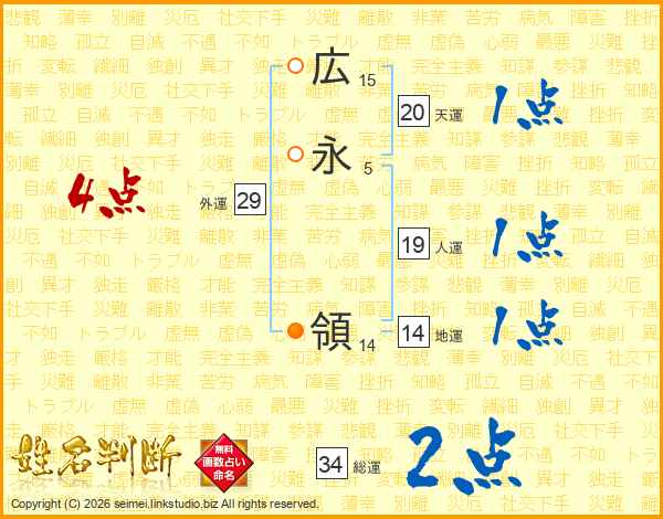 生活面を象徴する運勢です。外部から受ける影響力を表し、結婚運、家庭運や職場、環境への順応性を表します。総運から人運を引いた画数。姓や名が1文字の場合を除く。