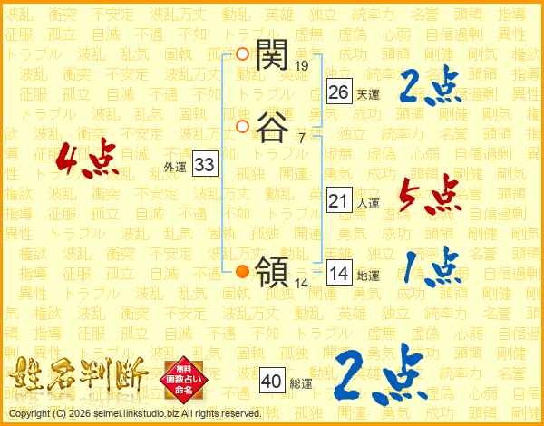関(19画)谷(7画) 領(14画)
