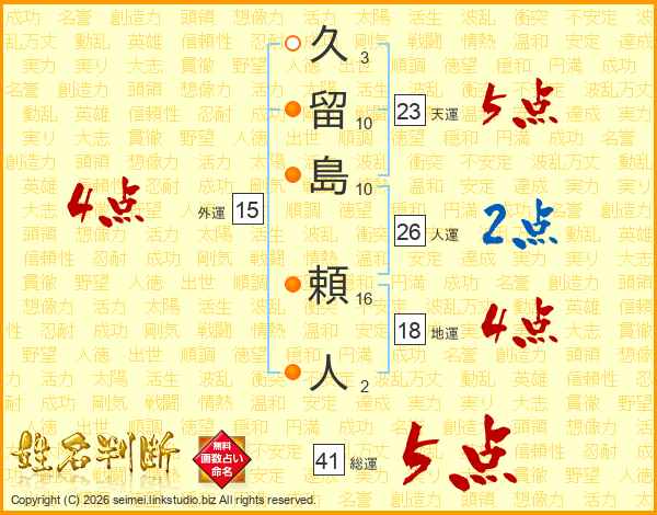 久留島頼人さんの総運は41画の5点!