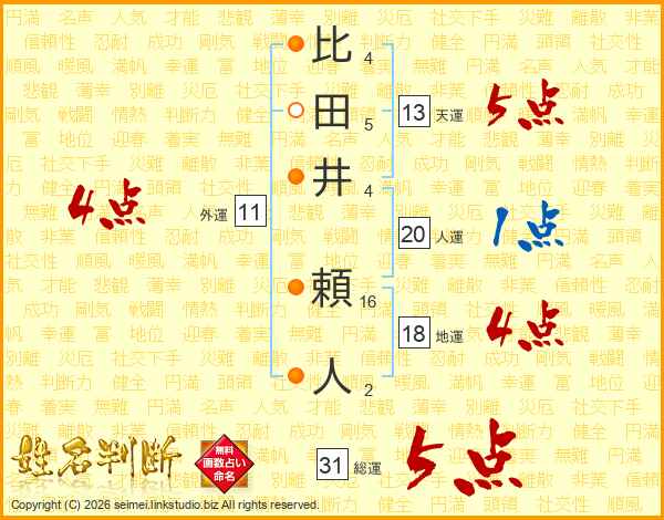 比(4画)田(5画)井(4画) 頼(16画)人(2画)
