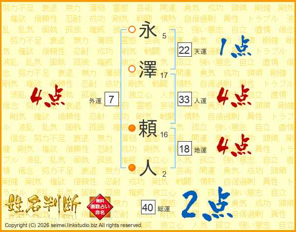 永澤頼人さんの総運は40画の2点!