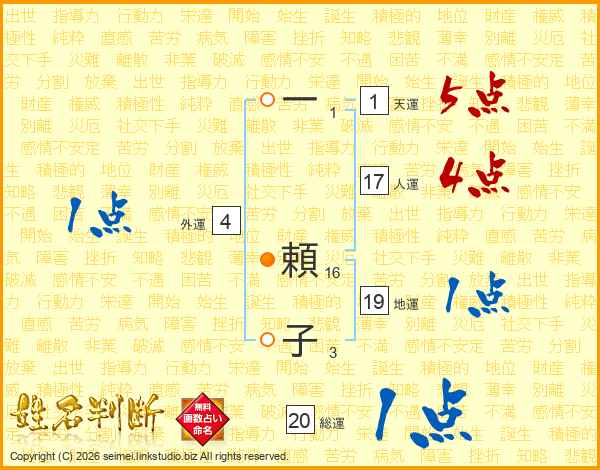 生活面を象徴する運勢です。外部から受ける影響力を表し、結婚運、家庭運や職場、環境への順応性を表します。総運から人運を引いた画数。姓や名が1文字の場合を除く。