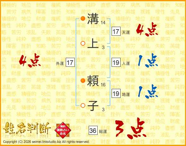 生活面を象徴する運勢です。外部から受ける影響力を表し、結婚運、家庭運や職場、環境への順応性を表します。総運から人運を引いた画数。姓や名が1文字の場合を除く。