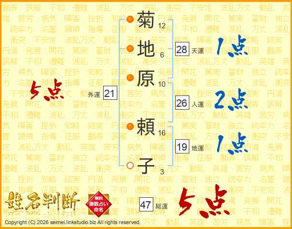 菊(12画)地(6画)原(10画) 頼(16画)子(3画)