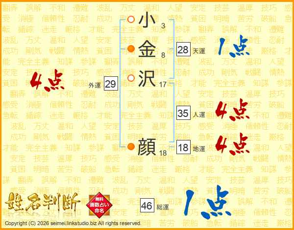 小(3画)金(8画)沢(17画) 顔(18画)