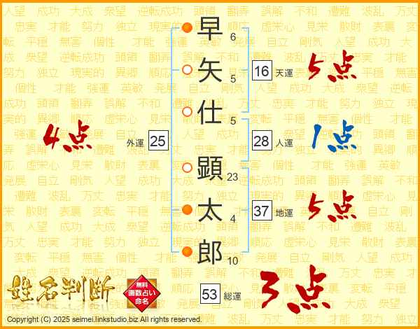 早(6画)矢(5画)仕(5画) 顕(23画)太(4画)郎(10画)