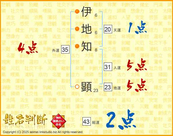 生活面を象徴する運勢です。外部から受ける影響力を表し、結婚運、家庭運や職場、環境への順応性を表します。総運から人運を引いた画数。姓や名が1文字の場合を除く。