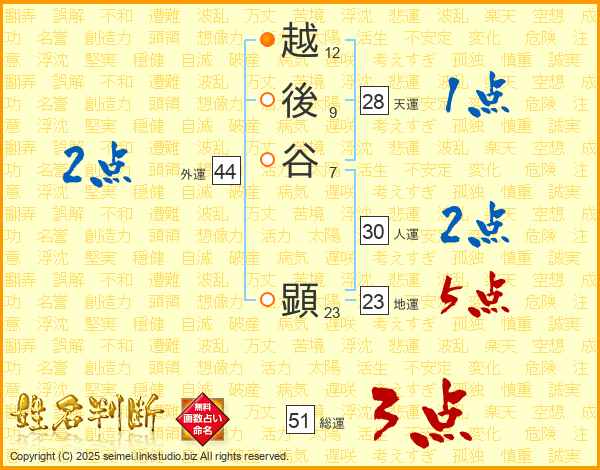 生活面を象徴する運勢です。外部から受ける影響力を表し、結婚運、家庭運や職場、環境への順応性を表します。総運から人運を引いた画数。姓や名が1文字の場合を除く。