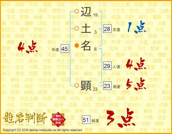 生活面を象徴する運勢です。外部から受ける影響力を表し、結婚運、家庭運や職場、環境への順応性を表します。総運から人運を引いた画数。姓や名が1文字の場合を除く。
