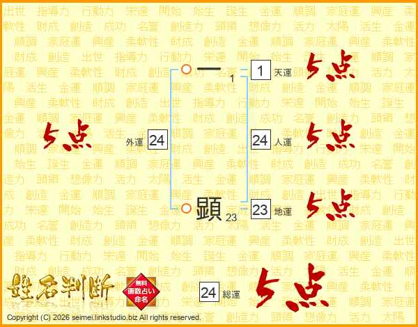 生活面を象徴する運勢です。外部から受ける影響力を表し、結婚運、家庭運や職場、環境への順応性を表します。総運から人運を引いた画数。姓や名が1文字の場合を除く。