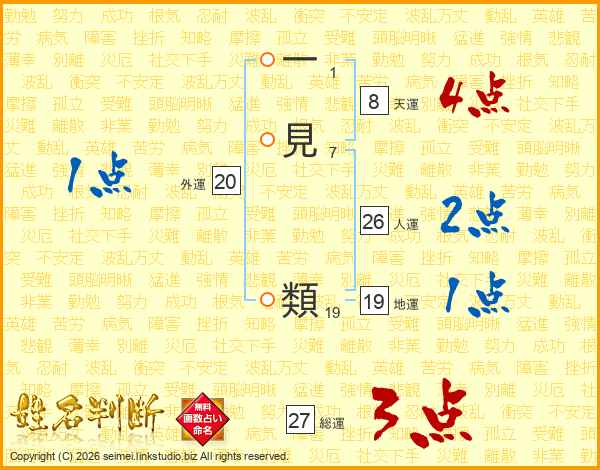 生活面を象徴する運勢です。外部から受ける影響力を表し、結婚運、家庭運や職場、環境への順応性を表します。総運から人運を引いた画数。姓や名が1文字の場合を除く。