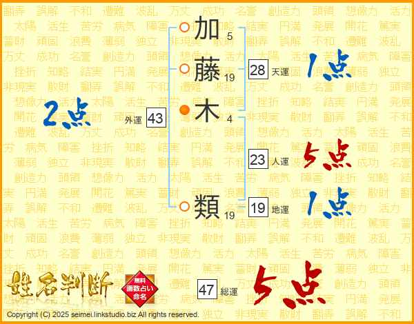 生活面を象徴する運勢です。外部から受ける影響力を表し、結婚運、家庭運や職場、環境への順応性を表します。総運から人運を引いた画数。姓や名が1文字の場合を除く。