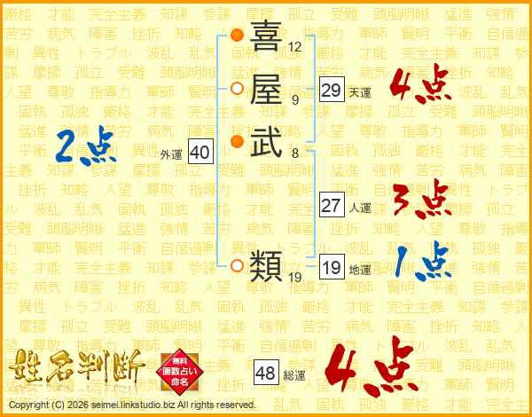 喜(12画)屋(9画)武(8画) 類(19画)