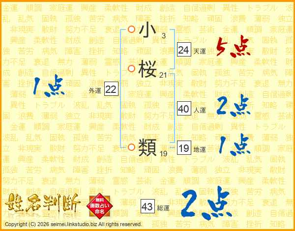 生活面を象徴する運勢です。外部から受ける影響力を表し、結婚運、家庭運や職場、環境への順応性を表します。総運から人運を引いた画数。姓や名が1文字の場合を除く。