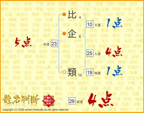 生活面を象徴する運勢です。外部から受ける影響力を表し、結婚運、家庭運や職場、環境への順応性を表します。総運から人運を引いた画数。姓や名が1文字の場合を除く。