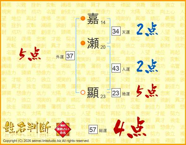 嘉瀬顯さんの総運は57画の4点!