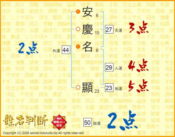 生活面を象徴する運勢です。外部から受ける影響力を表し、結婚運、家庭運や職場、環境への順応性を表します。総運から人運を引いた画数。姓や名が1文字の場合を除く。