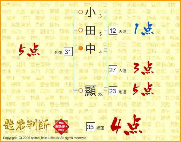 生活面を象徴する運勢です。外部から受ける影響力を表し、結婚運、家庭運や職場、環境への順応性を表します。総運から人運を引いた画数。姓や名が1文字の場合を除く。