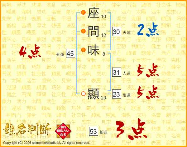 生活面を象徴する運勢です。外部から受ける影響力を表し、結婚運、家庭運や職場、環境への順応性を表します。総運から人運を引いた画数。姓や名が1文字の場合を除く。