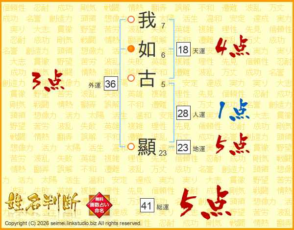 家系が持つ宿命的な運勢を表します。祖先から受け継いだ苗字ですので自分の力が及びません。家柄を象徴します。苗字の合計画数。