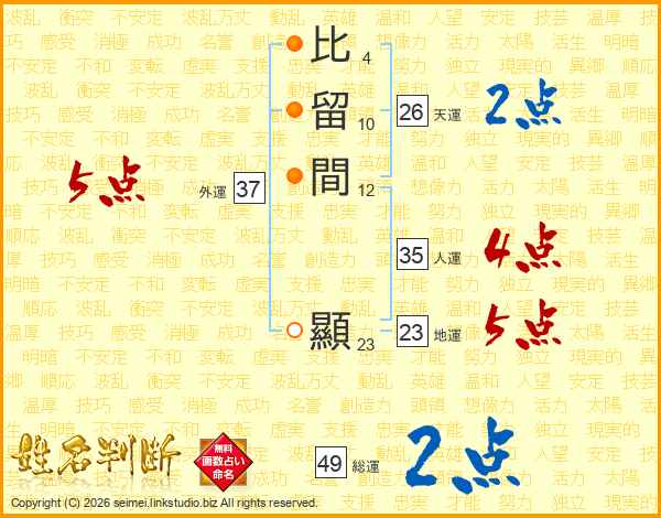 生活面を象徴する運勢です。外部から受ける影響力を表し、結婚運、家庭運や職場、環境への順応性を表します。総運から人運を引いた画数。姓や名が1文字の場合を除く。