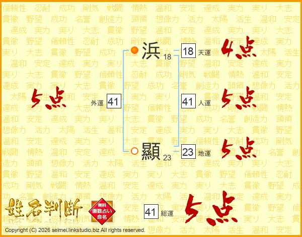 あなたの人生を表す1番重要な運勢です。生涯を通じて影響する総合運となり、主に50歳以降の晩年期に影響を及ぼします。苗字と名前の合計画数。