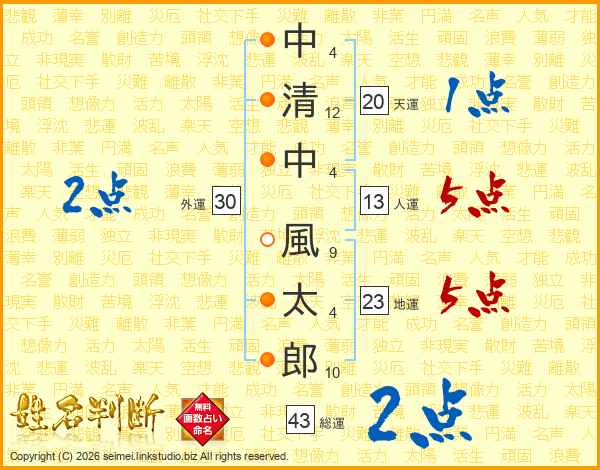 中(4画)清(12画)中(4画) 風(9画)太(4画)郎(10画)