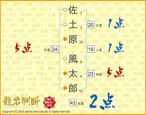 佐土原風太郎さんの総運は43画の2点!