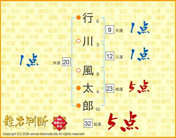 行川風太郎さんの総運は32画の5点!