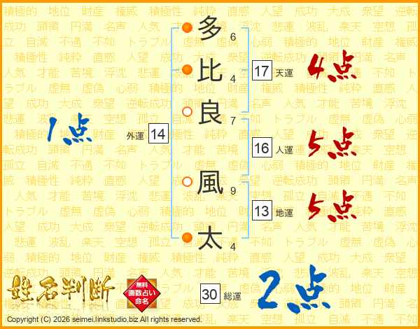 多(6画)比(4画)良(7画) 風(9画)太(4画)