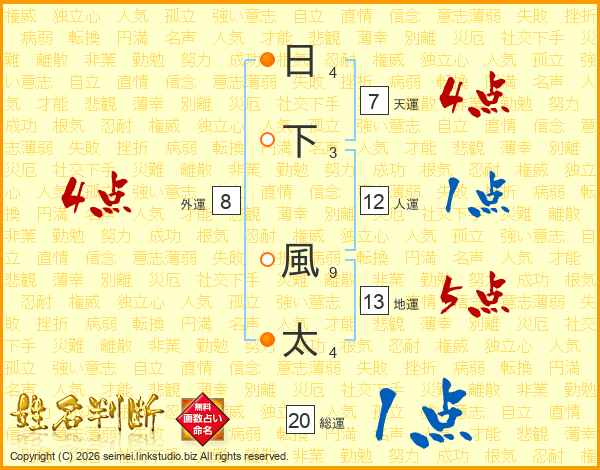 生活面を象徴する運勢です。外部から受ける影響力を表し、結婚運、家庭運や職場、環境への順応性を表します。総運から人運を引いた画数。姓や名が1文字の場合を除く。