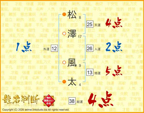 松(8画)澤(17画) 風(9画)太(4画)