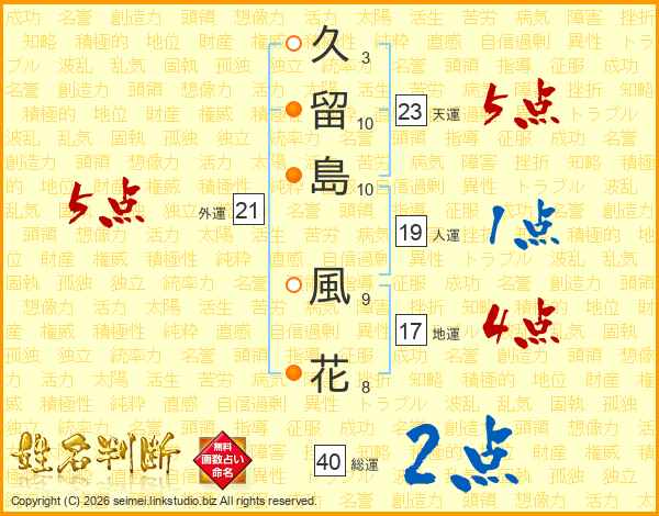 久(3画)留(10画)島(10画) 風(9画)花(8画)