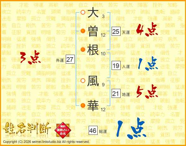 大(3画)曽(12画)根(10画) 風(9画)華(12画)