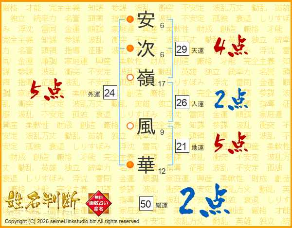 安次嶺風華さんの総運は50画の2点!