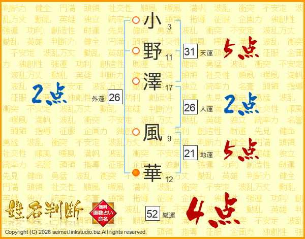 小(3画)野(11画)澤(17画) 風(9画)華(12画)