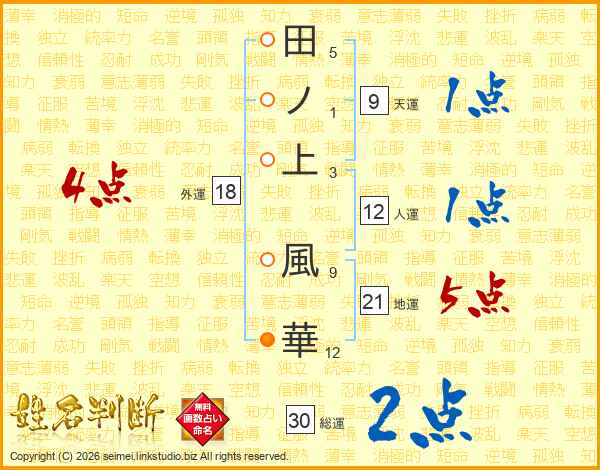 田(5画)ノ(1画)上(3画) 風(9画)華(12画)